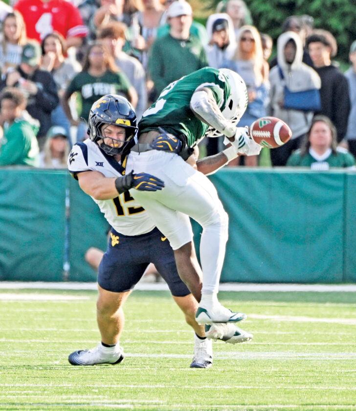 West Virginia University’s Ben Cutter (15) jars the ball loose from an Ohio receiver during Saturday’s game in Athens, Ohio. (Photo by David Pennock)