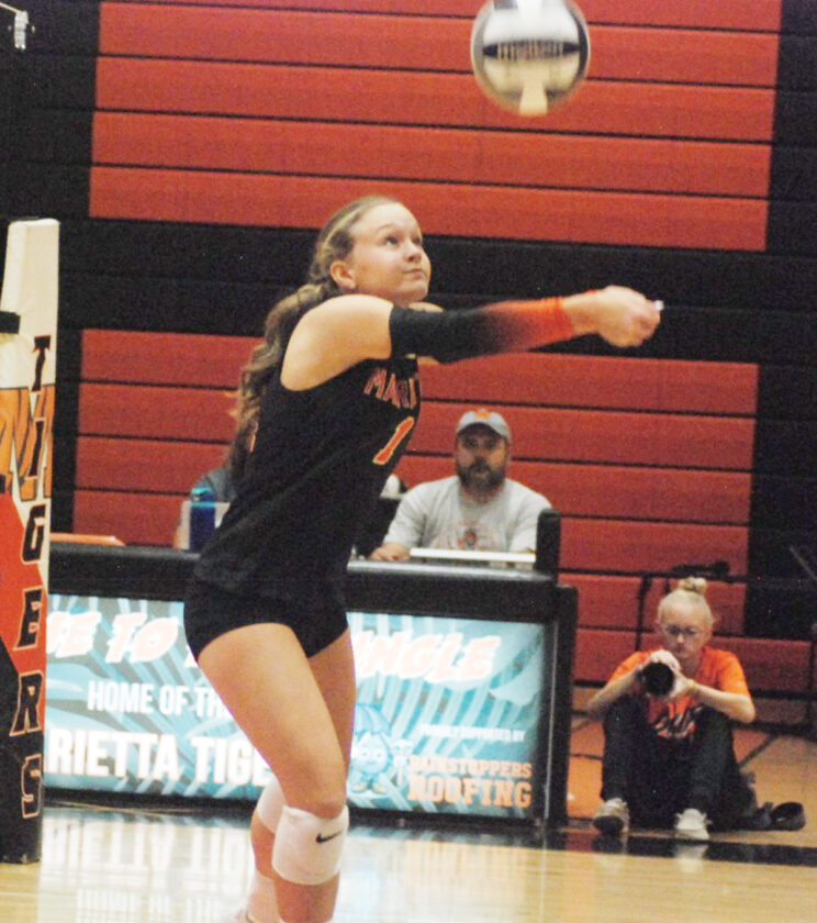 - Marietta’s Ava Prim bump sets the ball during the Tigers’ 3-1 setback to Warren on Tuesday night at Sutton Gymnasium. (Photo by Jay W. Bennett)
