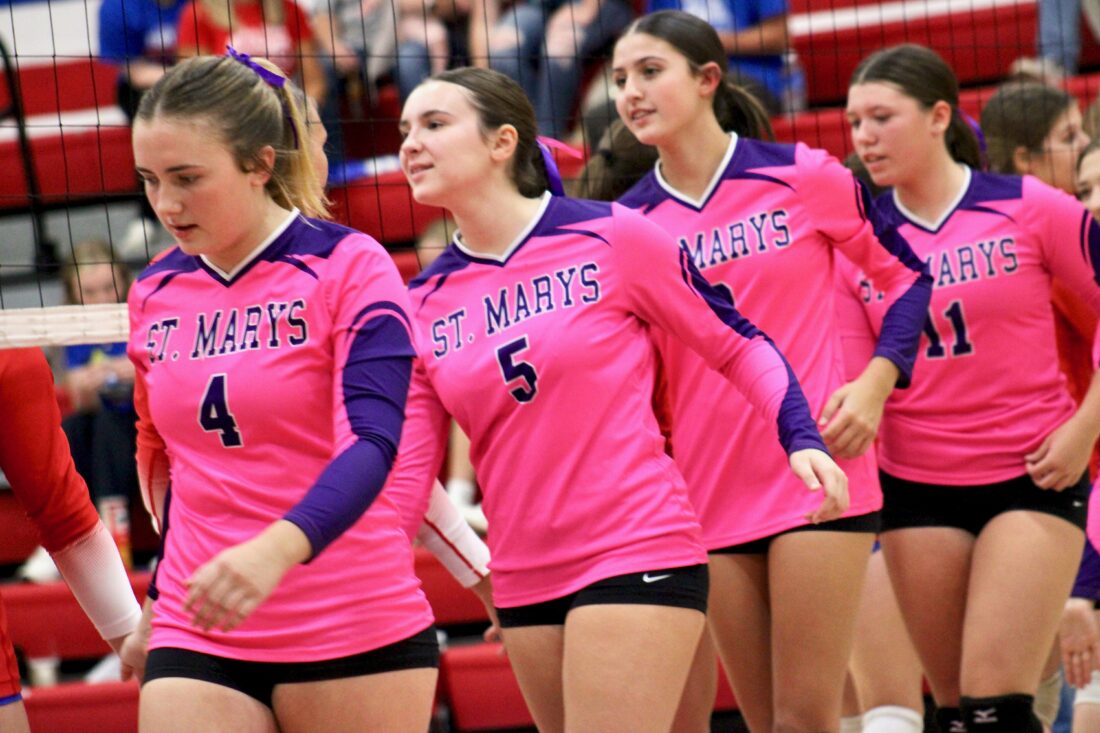 - St. Marys volleyball players Rylee Renner (4), Jaelyn Cupp (5), Morgan Bardwell (9) and Sophia Perkins (11) wear their “Relay for a Cure” uniforms during Thursday’s match with Fort Frye in Beverly. (Photo by Kerry Patrick)