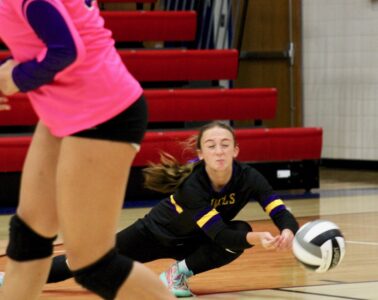 - Fort Frye libero Hannah Weiker dives for the ball during Thursday’s high school volleyball match against St. Marys in Beverly. (Photo by Kerry Patrick)