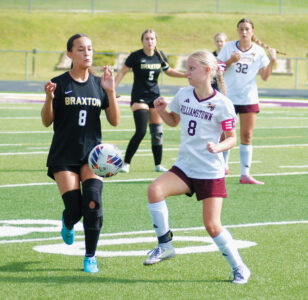 - Braxton County’s Bella Rollyson and Williamstown’s Kadence Bandy make a play on the ball during the Eagles’ 2-0 Little Kanawha Conference championship match victory Saturday at Bill Hanlin Stadium in St. Marys. (Photo by Jay W. Bennett)