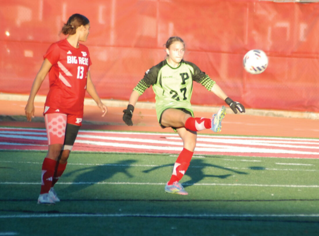 - Parkersburg keeper Addi Mosso sends the ball down the field as teammate Anniya Powell looks on during the No. 7 Class AAAA Big Reds’ 1-1 draw with top-ranked Wheeling Park on Tuesday at Stadium Field. (Photo by Jay W. Bennett)