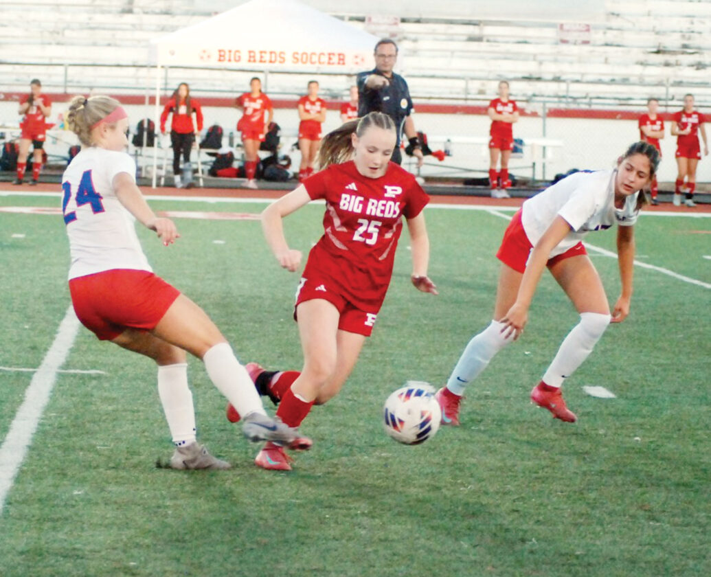 Parkersburg's Malaya Bowling dribbles between Wheeling Park's Aria Swartz (24) and Maggie Miller (17) during the No. 7 Class AAAA Big Reds' 1-1 draw with the top-ranked Patriots on Tuesday at Stadium Field. (Photo by Jay W. Bennett)