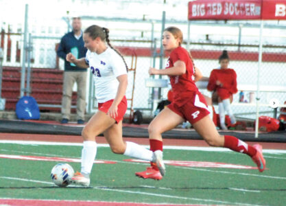 - Parkersburg’s Aelissa Stavrakis tries to chase down Wheeling Park’s Julia Dunaway during the No. 7 Class AAAA Big Reds’ 1-1 draw with the top-ranked Patriots on Tuesday at Stadium Field. (Photo by Jay W. Bennett)