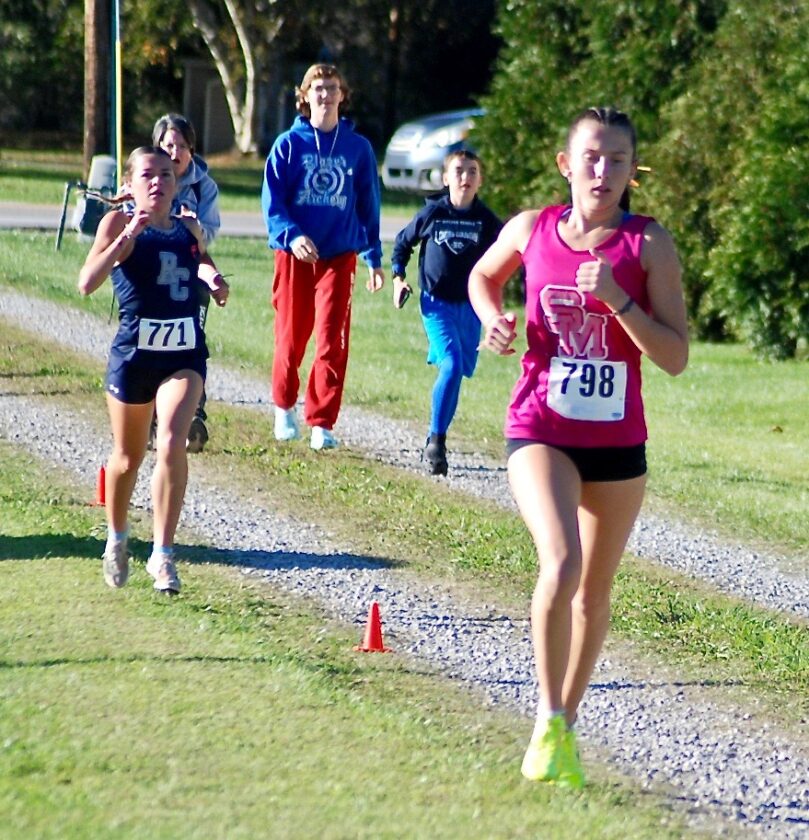 Anna Bennett of St. Marys runs ahead of Ritchie County's Bentlee Williams during Thursday's Little Kanawha Conference cross country championship. Bennett finished runner-up for the host Blue Devils while the Rebel placed fourth. (Photo by Jay W. Bennett)