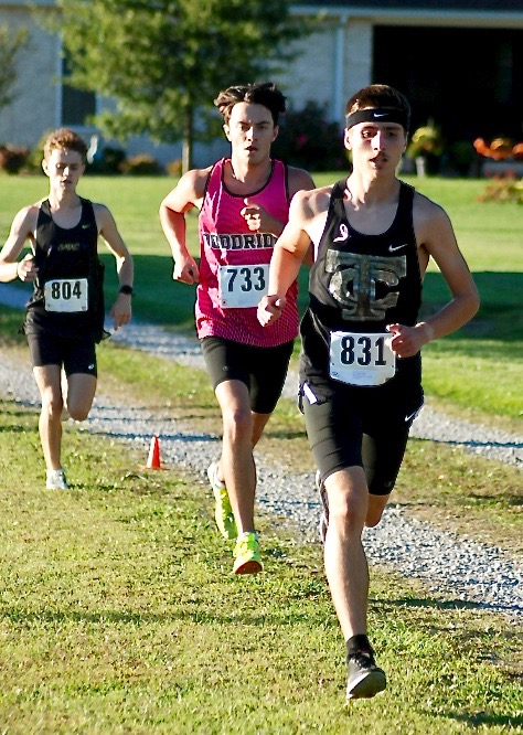 Tyler Consolidated's Travis Moore, who finished runner-up during Thursday's Little Kanawha Conference cross country championship to teammate Amos Kimble, runs ahead of Doddridge County's Carter Sias and St. Marys' Parker Barnes. (Photo by Jay W. Bennett)
