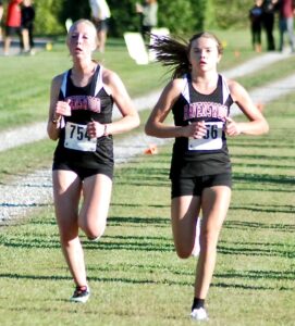 - Anna Bennett of St. Marys runs ahead of Ritchie County’s Bentlee Williams during Thursday’s Little Kanawha Conference cross country championship. Bennett finished runner-up for the host Blue Devils while the Rebel placed fourth. (Photo by Jay W. Bennett)