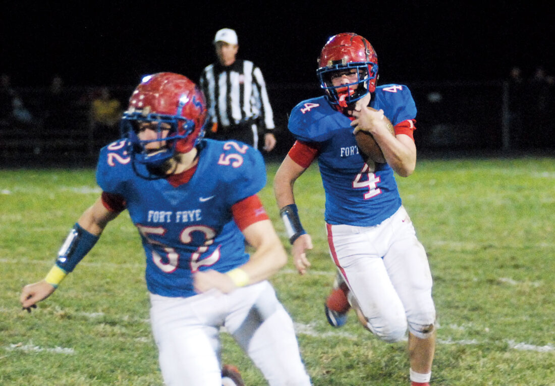 - Fort Frye’s Tyce Beardsley (4) follows the block of teammate Dayne Miller (52) against West Jefferson during Friday’s playoff game in Beverly. (Photo by Jordan Holland)