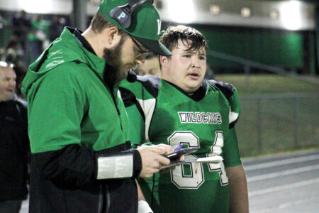 Waterford’s Ryker Hutchins (64) talks with a Waterford assistant coach on the sidelines during Friday’s Ohio Division VII regional semifinal. (Photo by Kerry Patrick)