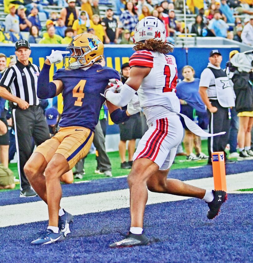 WVU wide receiver Cam Vaughn (4) reacts int he end zone during a game earlier this season against Utah in Morgantown. (Photo by David Pennock)