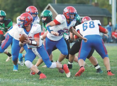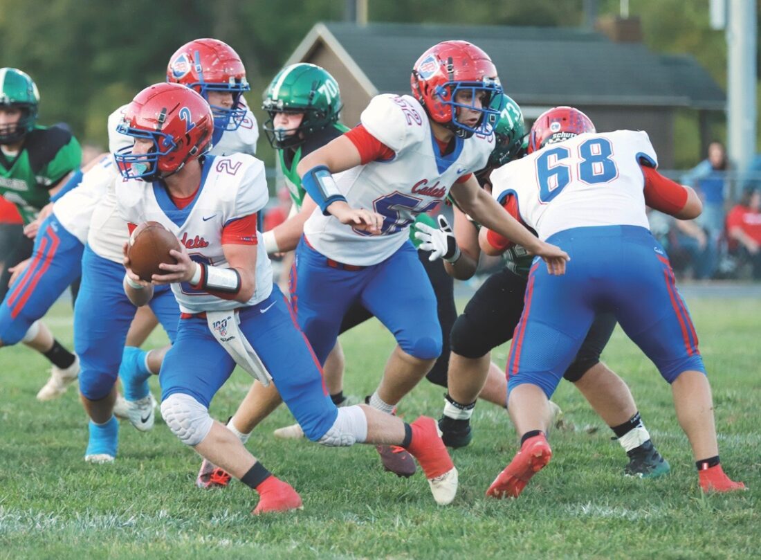 Fort Frye quarterback Grady Hesson (2) looks to hand off to a teammate during a game against Waterford earlier this season. The Cadets play host to Caldwell at 7 p.m. today in the regional quarterfinals. (Photo by Patricia Miller)