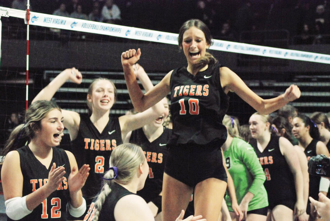 - Wirt County’s Addie Stephens (10) joins her teammates in celebration following the Tigers’ 3-1 victory versus East Hardy on Wednesday night in the Class A state semifinals. The Tigers will go after their first state title since 2020 on Thursday afternoon.(Photo by Jay W. Bennett)