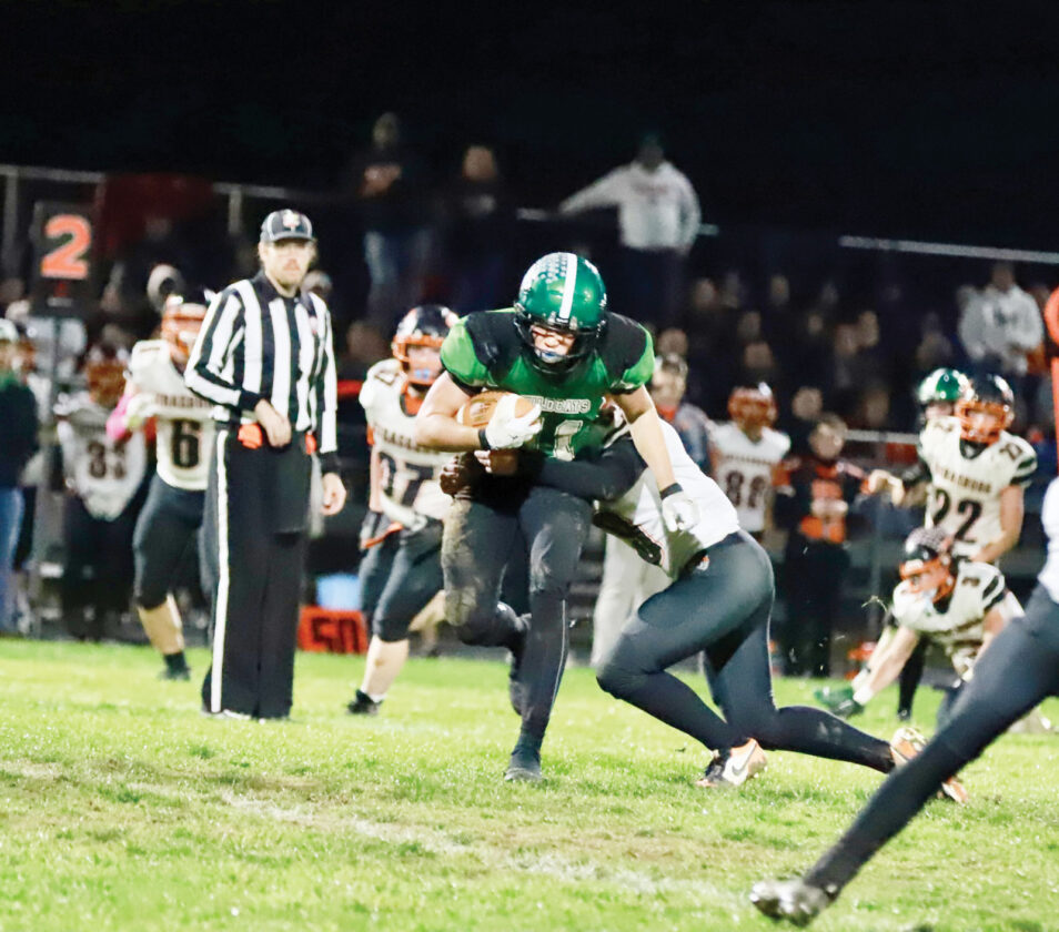 - Waterford’s Weston Fairchild (11) tries to break a tackle during last week’s playoff win against Strasburg. (Photo by Patricia Miller)