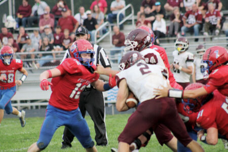 - Fort Frye linebacker Tytan Waller (12) tries to shed a block during a game against Wheeling Central earlier this season. (Photo by Kerry Patrick)