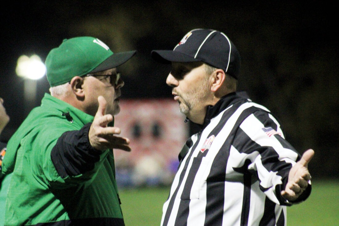 - Waterford head coach Eric McCutcheon, left, pleads his case to an official during the Wildcats’ 42-7 regional quarterfinal win over Strasburg-Franklin Friday. (Photo by Kerry Patrick)