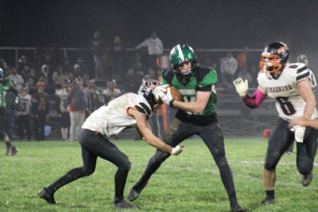 Waterford’s Hayden Jones (3) carries the ball as Strasburg-Franklin’s Gage Moore (6) goes in for the tackle during Friday’s regional quarterfinal matchup. Waterford won, 42-7. (Photo by Kerry Patrick)