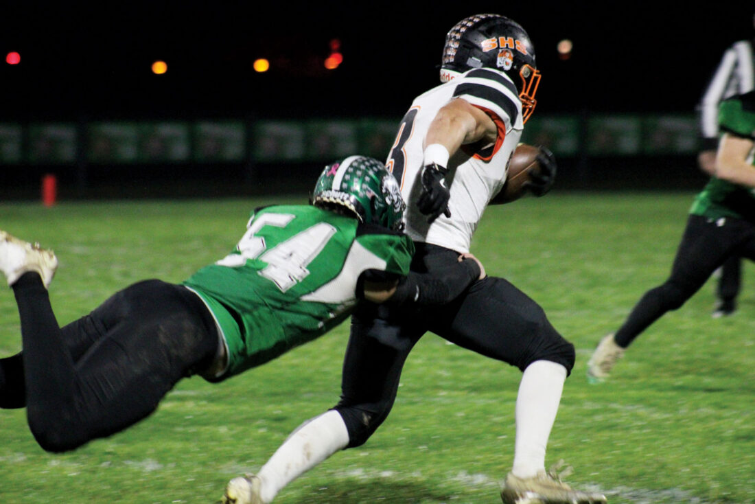 Waterford’s Weston Hennes (54) lays out to wrap up Strasburg-Franklin’s Micah McVey (3) during Friday’s regional quarterfinal matchup. Waterford won, 42-7. (Photo by Kerry Patrick)