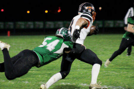- Waterford’s Weston Hennes (54) lays out to wrap up Strasburg-Franklin’s Micah McVey (3) during Friday’s regional quarterfinal matchup. Waterford won, 42-7. (Photo by Kerry Patrick)