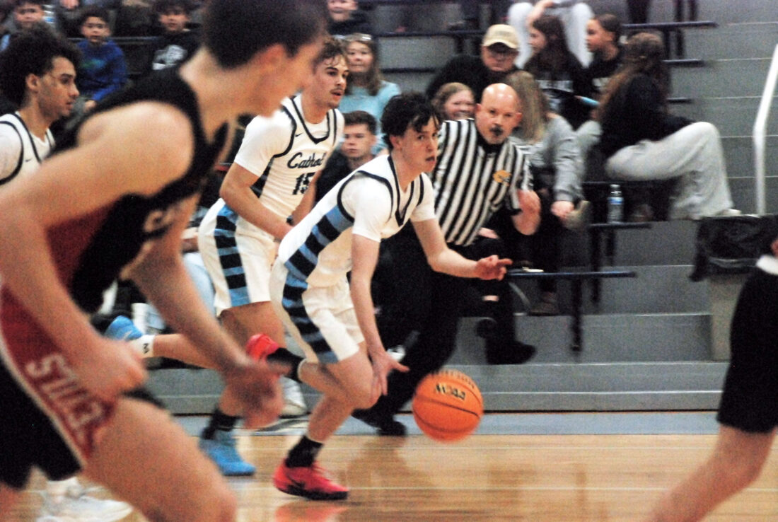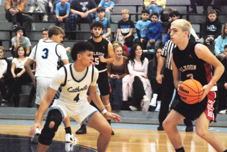 - Calhoun County’s Trevor Mayle looks to pass while being guarded by Parkersburg Catholic’s Leonardo DeAngelo during the Crusaders’ 100-44 Little Kanawha Conference victory Friday night. (Photo by Jay W. Bennett)