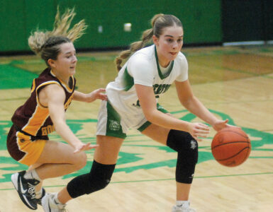 - Waterford’s Brynnlee Pottmeyer, right, dribbles around Federal Hocking’s Brenlee Cottrill during Saturday’s game at the Harry Cooper Annex. (Photo by Jordan Holland)