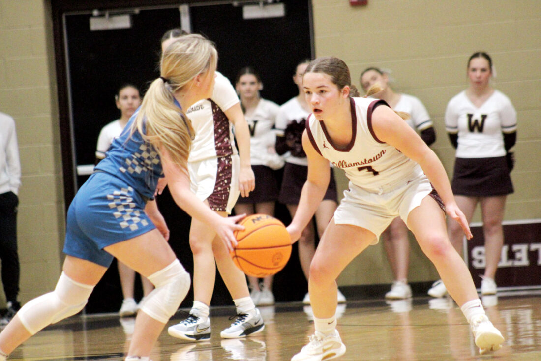 - Williamstown’s Quinn Bunch (3) guards Tyler Consolidated’s Faith Lemasters during Thursday’s game. (Photo by Kerry Patrick)