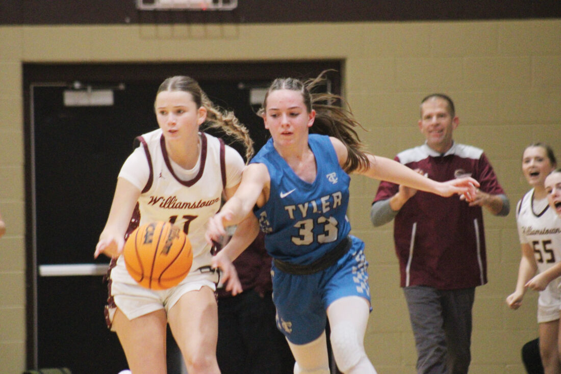 - Tyler Consolidated’s Andi Fiber (33) pokes the ball away from Williamstown’s Alia Phelps during Thursday’s game. (Photo by Kerry Patrick)