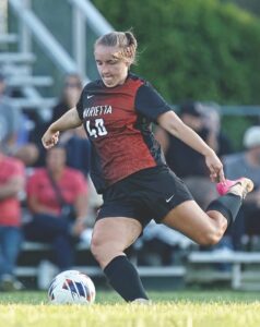 - Marietta’s Grace Spencer strikes the ball during a girls soccer match this season. (Photo by Rebecca Wheeler Photography)