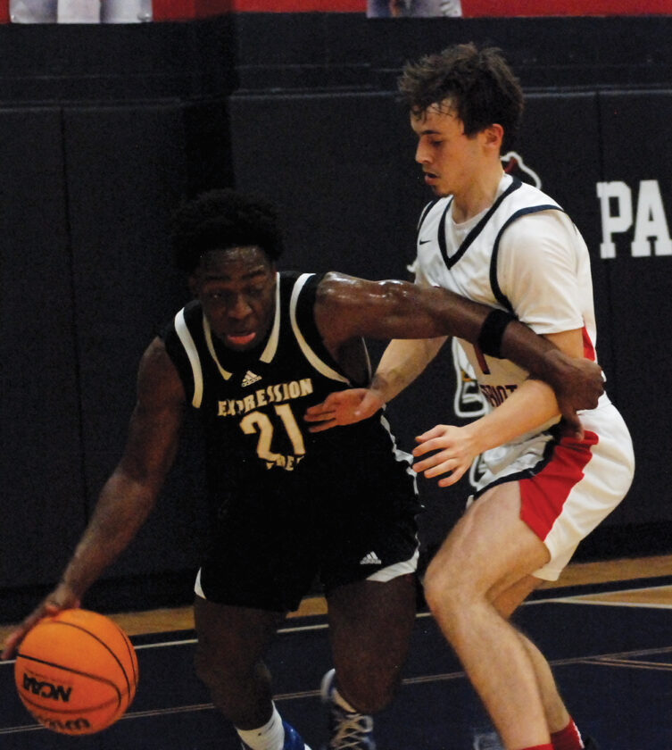 Parkersburg South's Bowen Rader tries to cut off Expression Prep's BJ McCreath during the Patriots' 100-55 victory Saturday night inside Rod Oldham Athletic Center. (Photo by Jay W. Bennett)