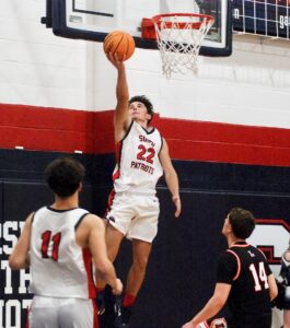 - Parkersburg South’s Logan Graham goes up for a reverse lay-in during the Patriots’ 100-57 victory Thursday night inside Rod Oldham Athletic Center. (Photo by Jay W. Bennett)