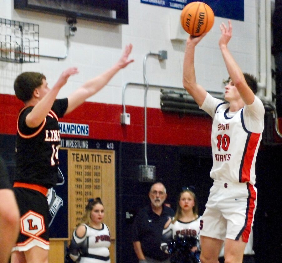 Parkersburg South's Harry Silvis, who scored a game-high 26 points in three quarters of action, knocks down a jumper over Linsly's David Stankovic during the Patriots' 100-57 victory Thursday night inside Rod Oldham Athletic Center. (Photo by Jay W. Bennett)