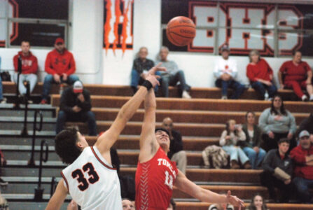 - Belpre’s Malakai Ensor, who double-doubled with 15 points and a game-high 11 rebounds, goes up for the jump ball with Trimble’s Brady Jajczyk during the Golden Eagles’ 71-61 Tri-Valley Conference Hocking Division victory Thursday night. (Photo by Jay W. Bennett)