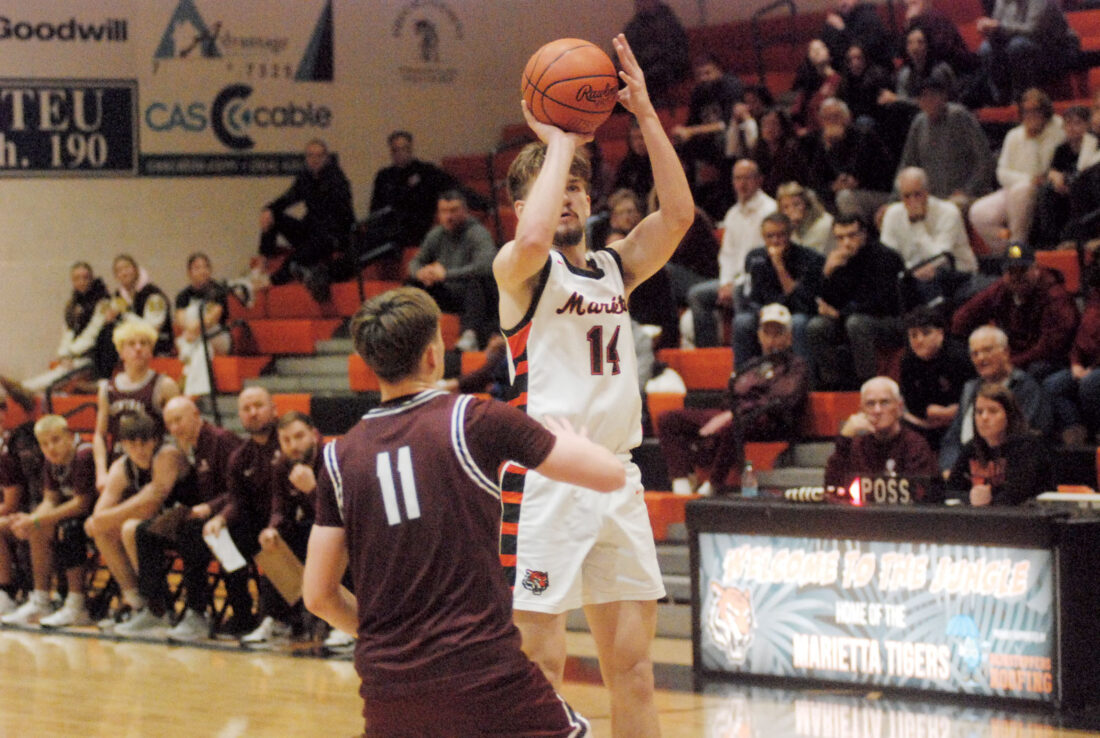 Marietta got within two, 30-28, with 3:07 left in the second after consecutive 3-pointers by Trenton McVey and Wittekind. However, Eli Sancomb responded with another stepback triple before Luke Sancomb nailed back-to-back triples to stretch the margin to 10, 41-31, at halftime.