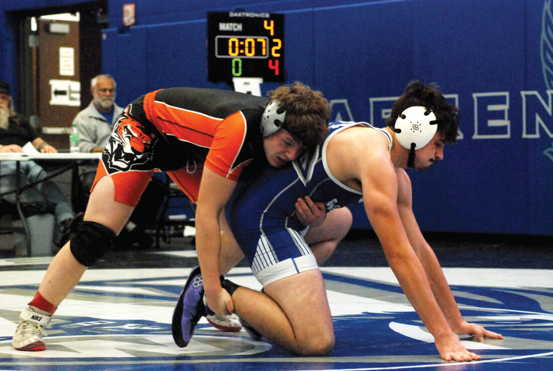 - Waterford’s Cadon Riley and Fort Frye’s Steven Lenhart battle during a heavyweight match at Saturday’s Hickory Grove Market Invitational. (Photo by Jay W. Bennett)