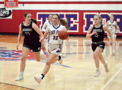 - Fort Frye’s Ella Dowler (32) brings the ball up the court as Shenandoah’s Molly Van Fleet (33) and Emma Dailey (15) defend during Wednesday’s game at Dan Liedtke Court. (Photo by Mike Morrison)