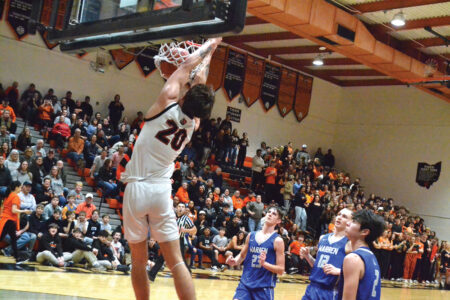 Marietta’s Zaiden Wittekind (20) finishes a thundering two-handed duck while a trio of Warren Warriors look on. Wittekind scored 27 points Monday as the Tigers downed Warren 75-66 at Sutton Gym. (Photo by Mike Morrison)