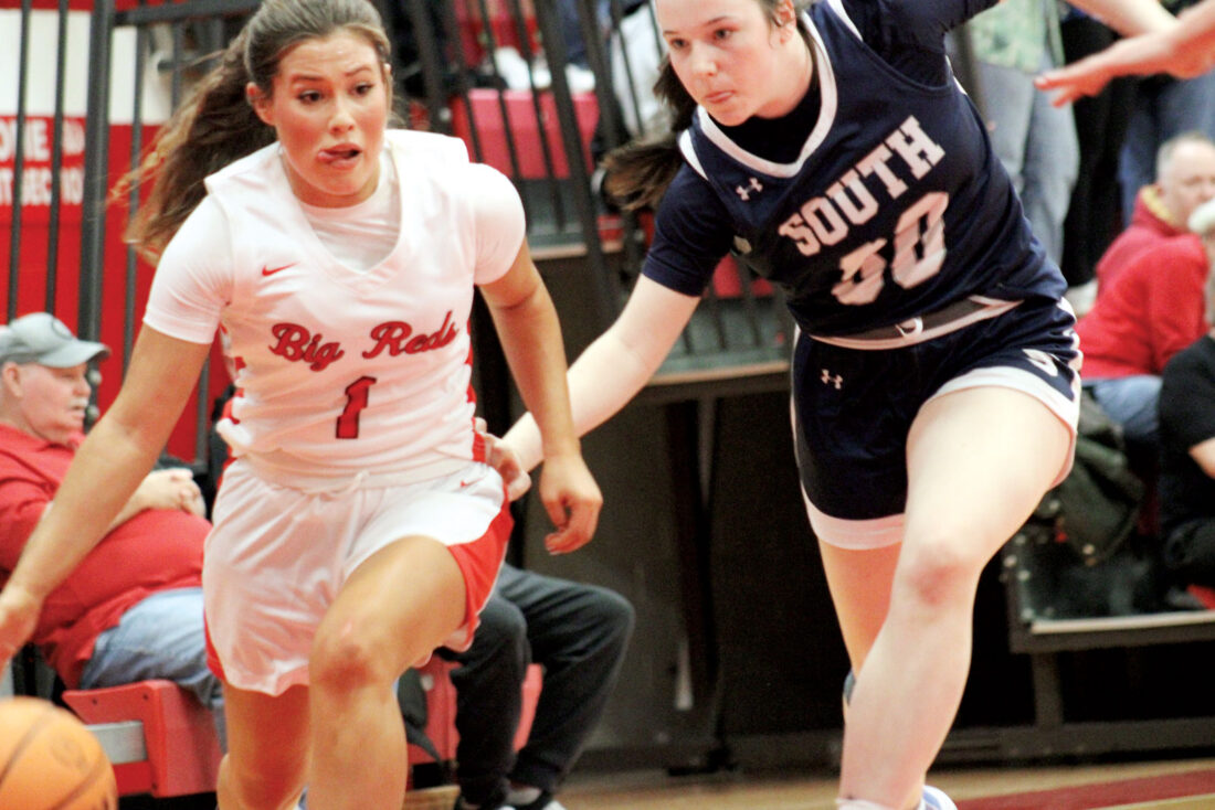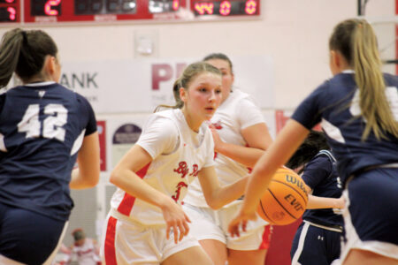 Playing on their home floor didn’t give PHS an advantage in the shooting department. Shots which usually fall, didn’t. The Big Red tandem of guards – Lauren Flanagan and Frances Guice – were held scoreless in the first half.