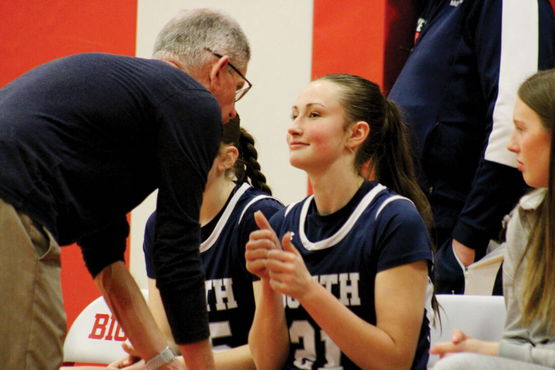 - Parkersburg South girls basketball coach Ed Davis, left, tells Kenna Mace a job well done as the final seconds tick off the clock in the Patriots’ 60-54 win over Parkersburg at Memorial Fieldhouse. (Photo by Kerry Patrick)