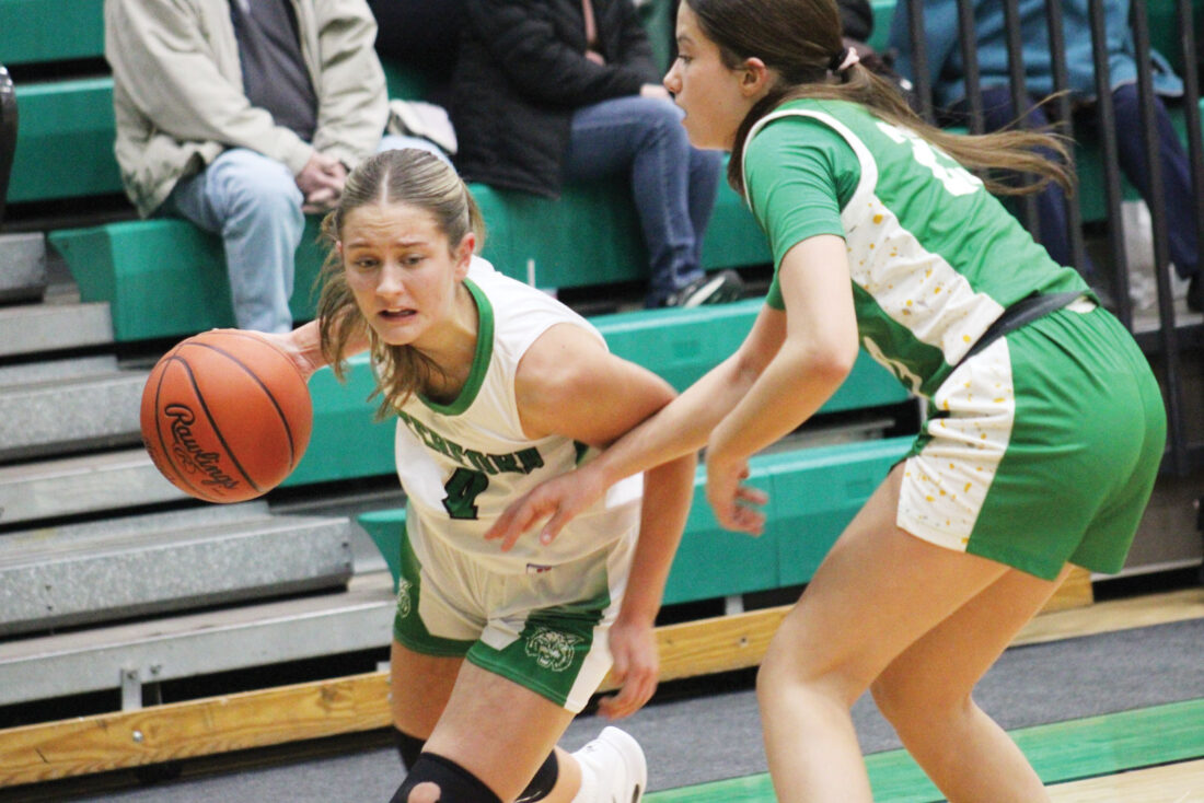 - Waterford’s Gracie Hartline (4) handles the ball as Eastern’s Emeri Lloyd (23) defends during Thursday’s game at the Harry Cooper Annex. (Photo by Kerry Patrick)