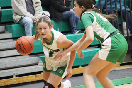 - Waterford’s Shaeli Hayes, left, brings the ball up the court as Eastern’s Braelyn Simpson defends during Thursday’s game at the Harry Cooper Annex. (Photo by Patricia Miller)