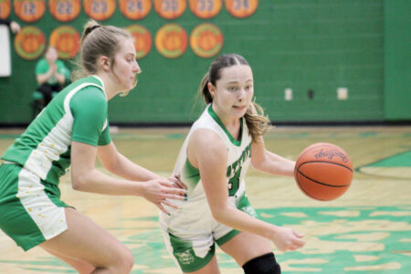 - Waterford’s Brynnlee Pottmeyer (12) makes a move with the ball as Eastern’s Kyrstin Fackler (3) defends during Thursday’s game at the Harry Cooper Annex. (Photo by Kerry Patrick)