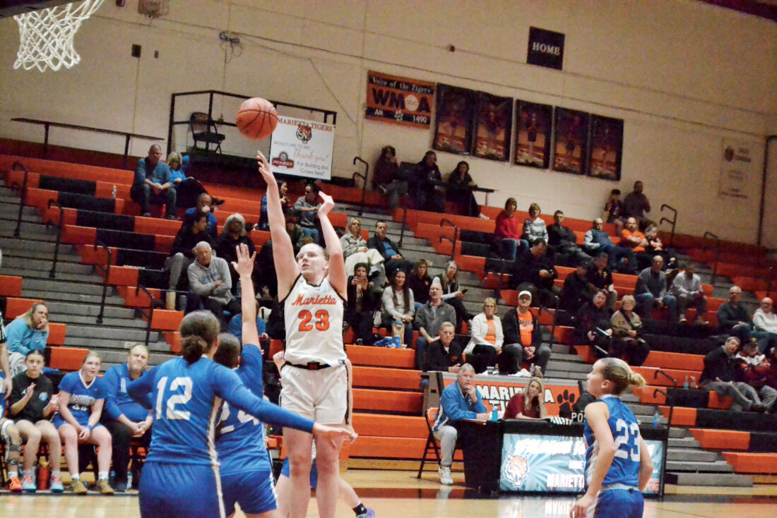 - Marietta’s Hayleigh Chidester (3) puts up a shot while being defended by Washington Court House’s Calee Ellars (23) Monday night at Sutton Gym. The Tigers downed the Lions 50-44 in overtime. (Photo by Mike Morrison)