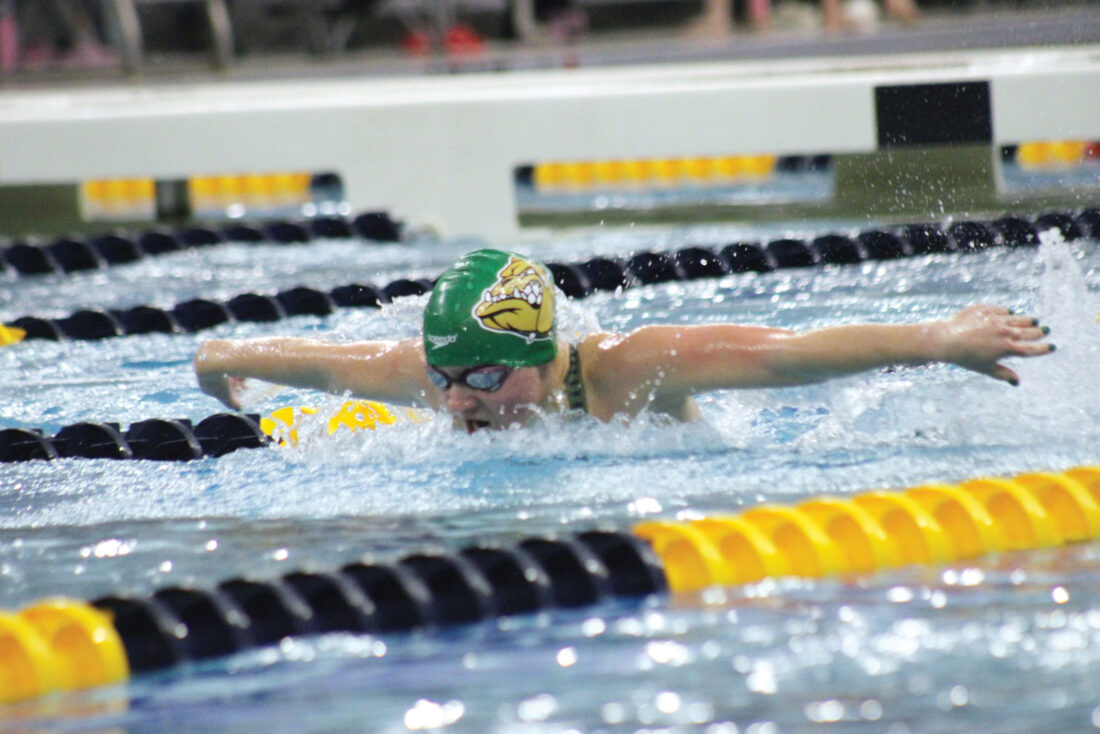 Doddridge County junior Isabella McGrady swims the butterfly at last year’s West Virginia High School State Swim Meet in Morgantown. McGrady is the top seed in the 100 butterfly for this year’s event. (Photo by Kerry Patrick)