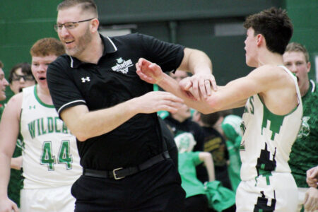 Waterford boys basketball coach DJ Cunningham, left, and Wildcats’ Gavin Hiener celebrate the Wildcats’ 35-34 win over Belpre, Friday in a Division VI District Quarterfinal in Waterford. (Photo by Kerry Patrick)