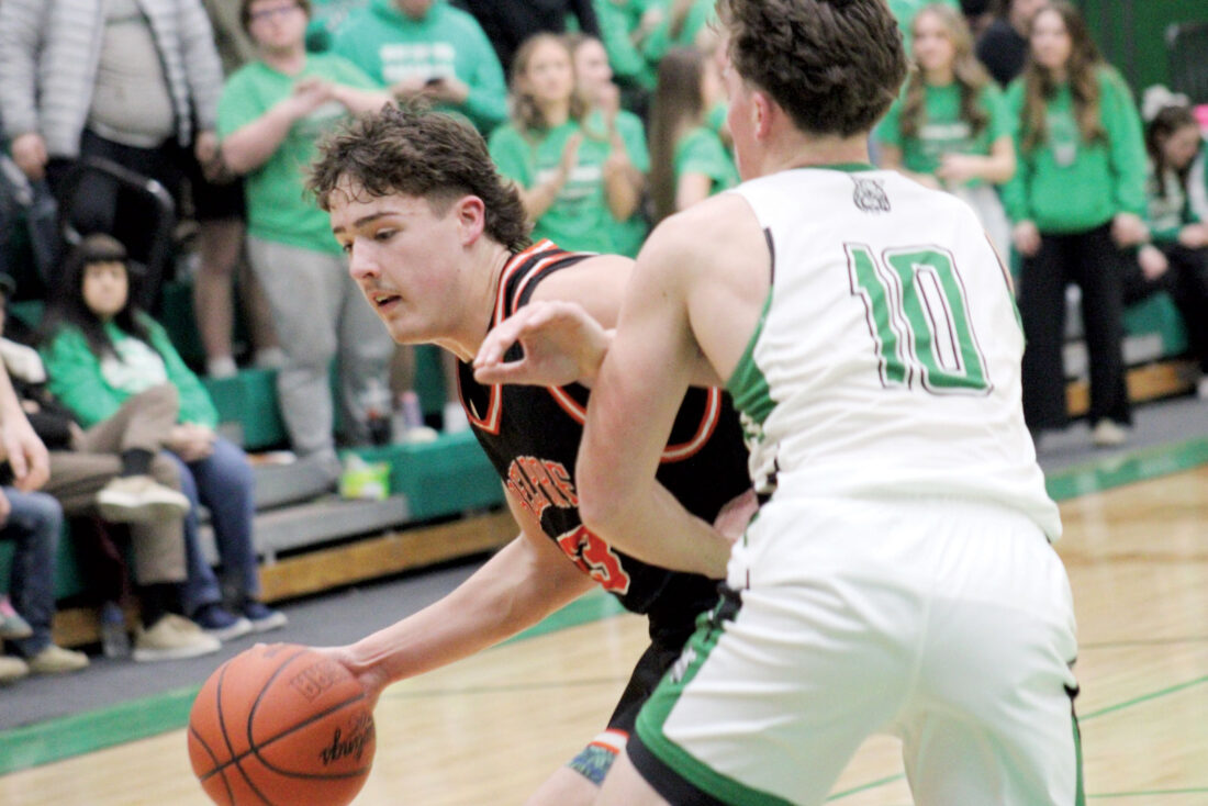 - Belpre’s Haiden Tabler, right, stays stride for stride with Waterford point guard Finn Pennock (23) during Friday’s Division VI District Quarterfinal in Waterford. (Photo by Kerry Patrick)