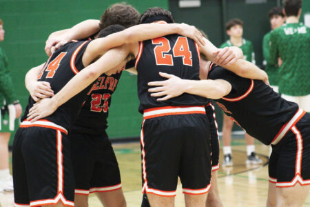 - Belpre’s starting five gather in a huddle prior to tip-off of Friday’s Division VI District Quarterfinal game at Waterford. (Photo by Kerry Patrick)