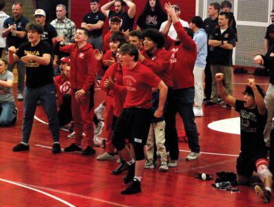 - Members of the Parkersburg High School wrestling team celebrate following Big Red 150-pounder Kayden McDonald’s 7-6 victory against Parkersburg South’s Asa Yost during the finals of Saturday’s Division I, Region 4 tournament inside Memorial Fieldhouse. (Photo by Jay W. Bennett)