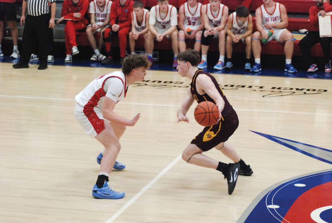 - Fort Frye’s Ethan Wagner defends against Federal Hocking’s Cam Joy during the Cadets’ 54-49 victory Friday night. (Photo by Jay W. Bennett)