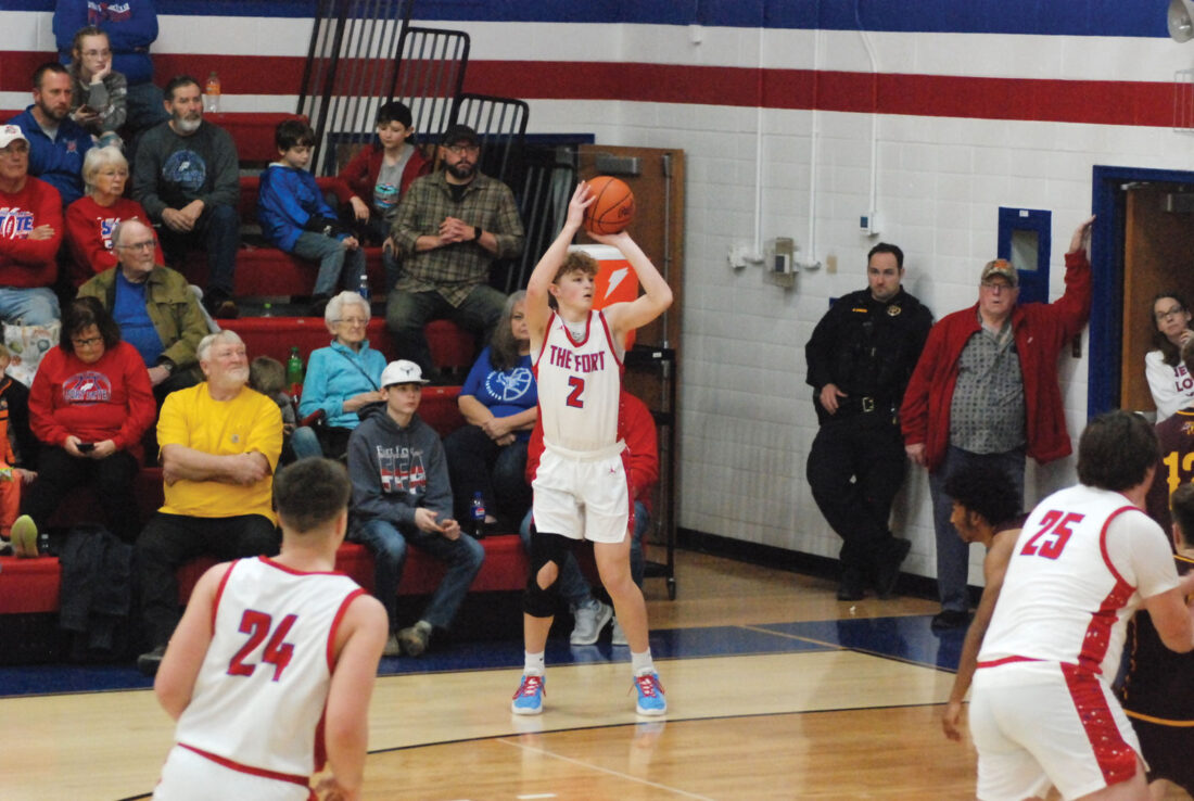 - Fort Frye’s Nate Adams, who had 10 points, eight rebounds and a game-high five assists, drains a 3 during the Cadets’ 54-49 victory Friday night versus Federal Hocking. (Photo by Jay W. Bennett)