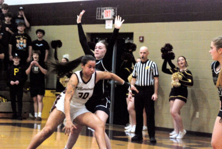 Williamstown's Anna Cosner, who celebrated a victorious senior night with teammate Arissa Burt following the Yellowjackets' 55-43 Little Kanawha Conference triumph Thursday versus Ritchie County, changes direction while being defended by Chelsie Jeffrey. (Photo by Jay W. Bennett)
