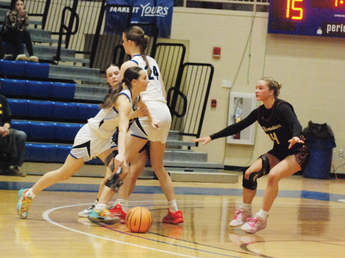 Gilmer County’s Blair Dobbins sets a screen against Williamstown’s Anna Cosner as Yellowjacket teammate Maggie Frye switches to defend Lena Frymier during Saturday night’s Little Kanawha Conference championship game at Glenville State University’s Waco Center. (Photo by Jay W. Bennett)